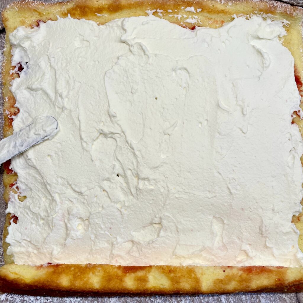 Tipp: Die Rolle wird noch fruchtiger, wenn du unter die Sahne 100 g Erdbeermarmelade auf den ausgekühlten Biskuit streichst.