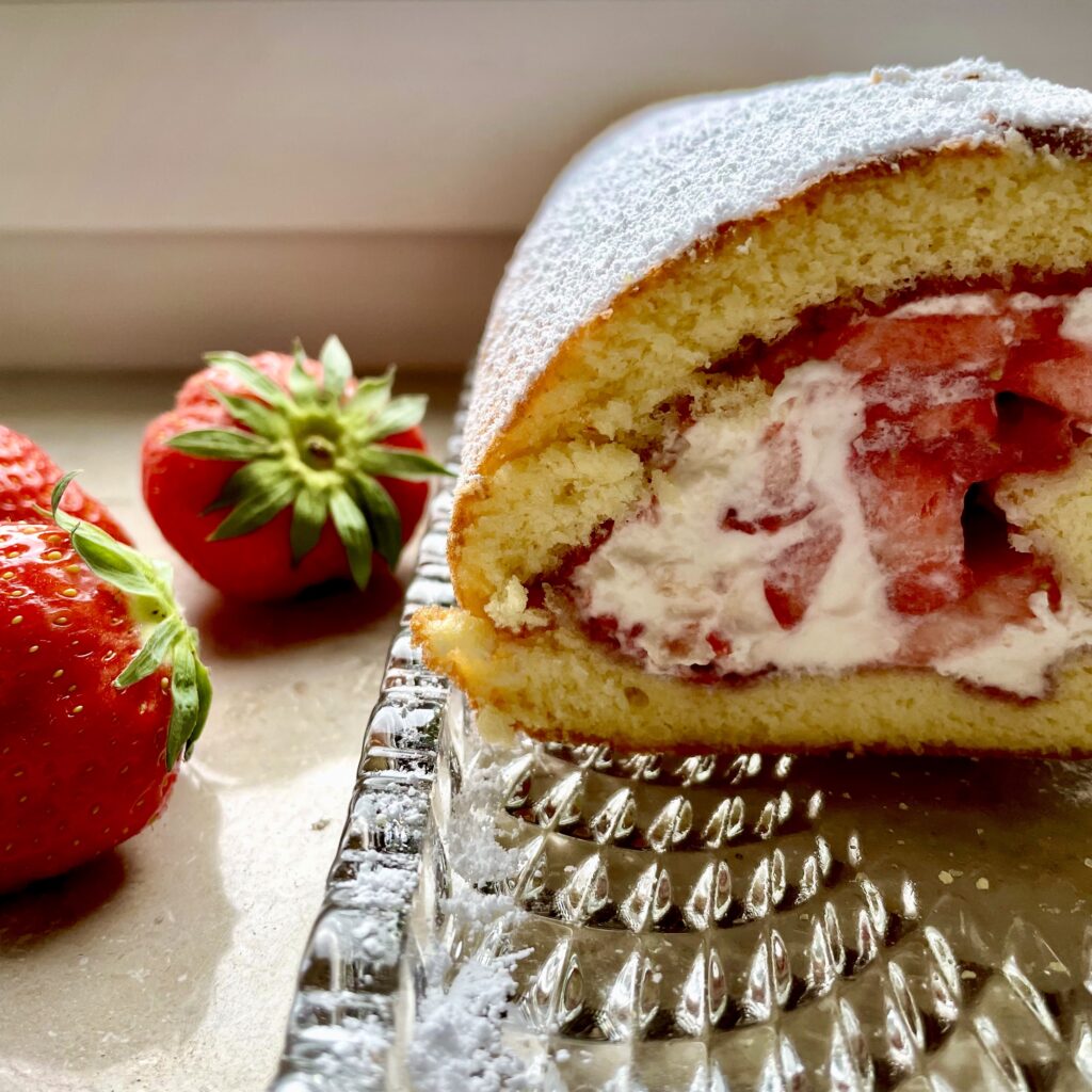 Diese Biskuitroulade eignet sich als Basis für viele Varianten. Ich habe die klassische Füllung mit Erdbeeren und Schlagsahne gewählt. Im Frühsommer ist das der perfekte Nachmittagskuchen.