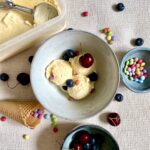 Am nächsten Tag die Vanilleschote entfernen und die Eismasse in die Eismaschine füllen. Je Gerät dauert es nun etwa 30 Minuten bis die Masse cremig gefriert. Mit einem Spachtel die Masse in eine Box mit Deckel umfüllen und nochmal 3-6 Stunden im Gefrierfach einlagern. Nun kannst du das Eis mit den Toppings deiner Wahl servieren.