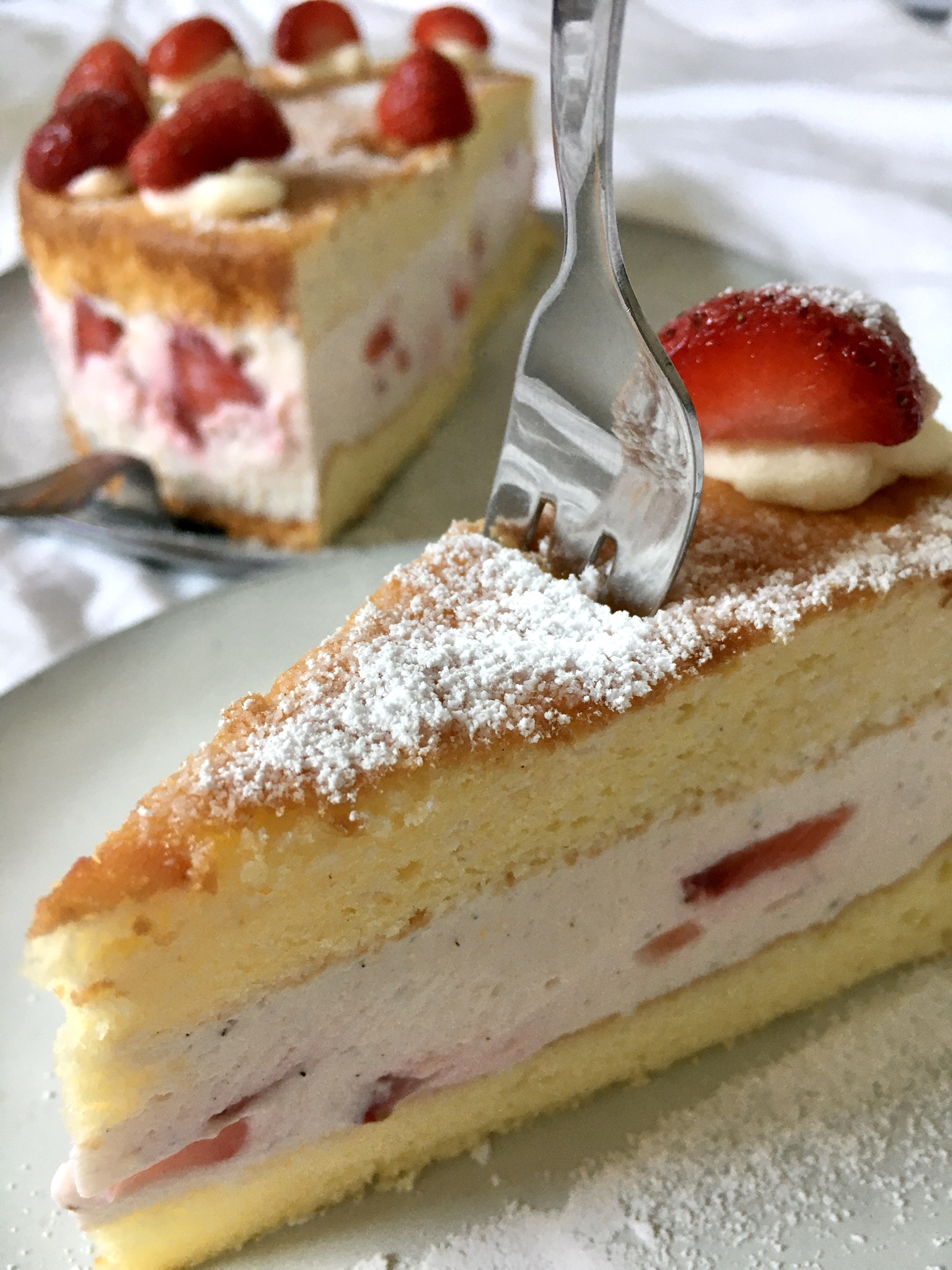 Im Kühlschrank für 12 Stunden kaltstellen. Dann die restliche Sahne mit etwas Zucker schlagen und die Torte mit Sahnetupfen und Puderzucker dekorieren. Die restlichen frischen Erdbeeren auf die Sahnetupfer legen.