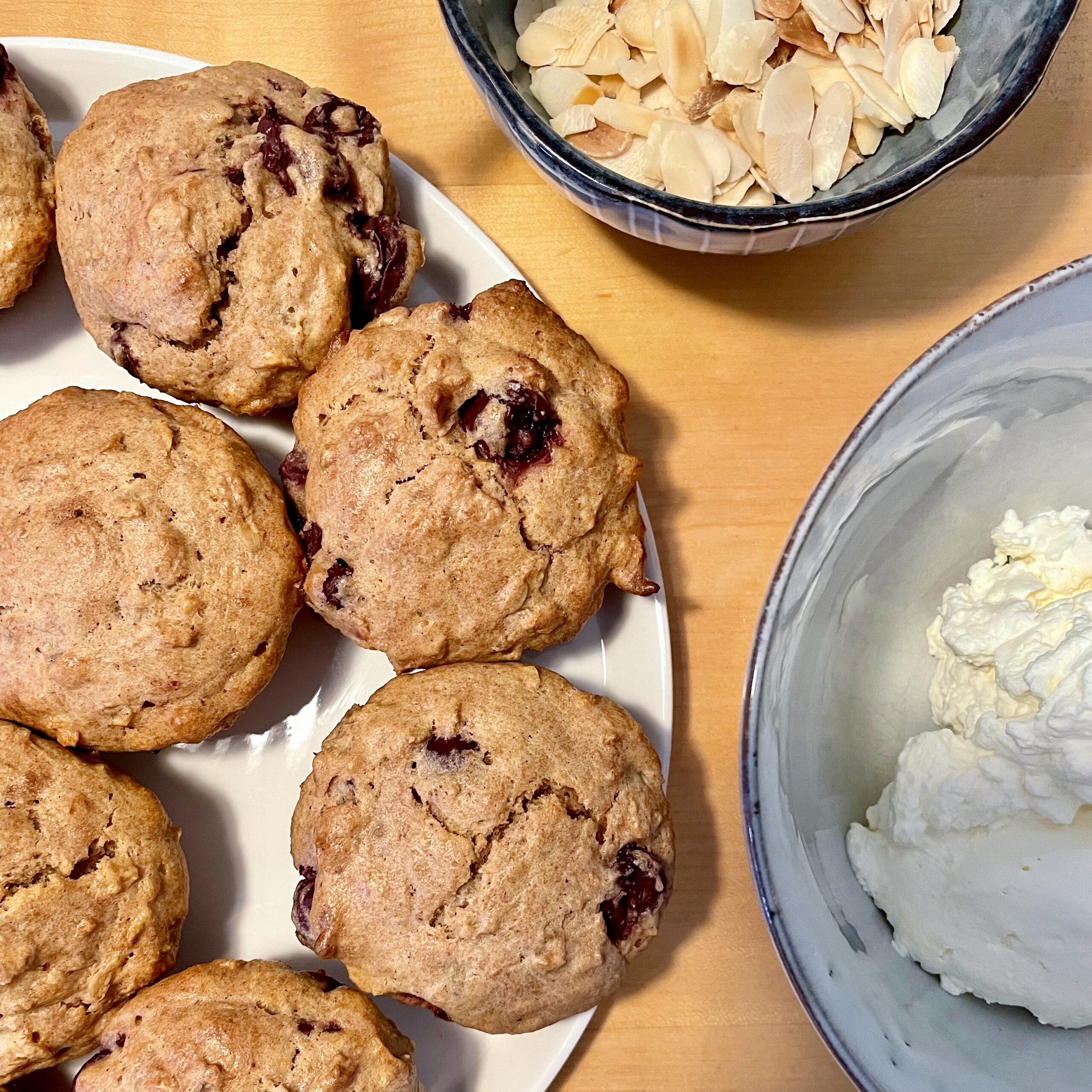 Zum Servieren die Sahne steif schlagen und die Mandelblättchen in einer Pfanne goldgelb rösten und beides auf den abgekühlten Muffins verteilen.