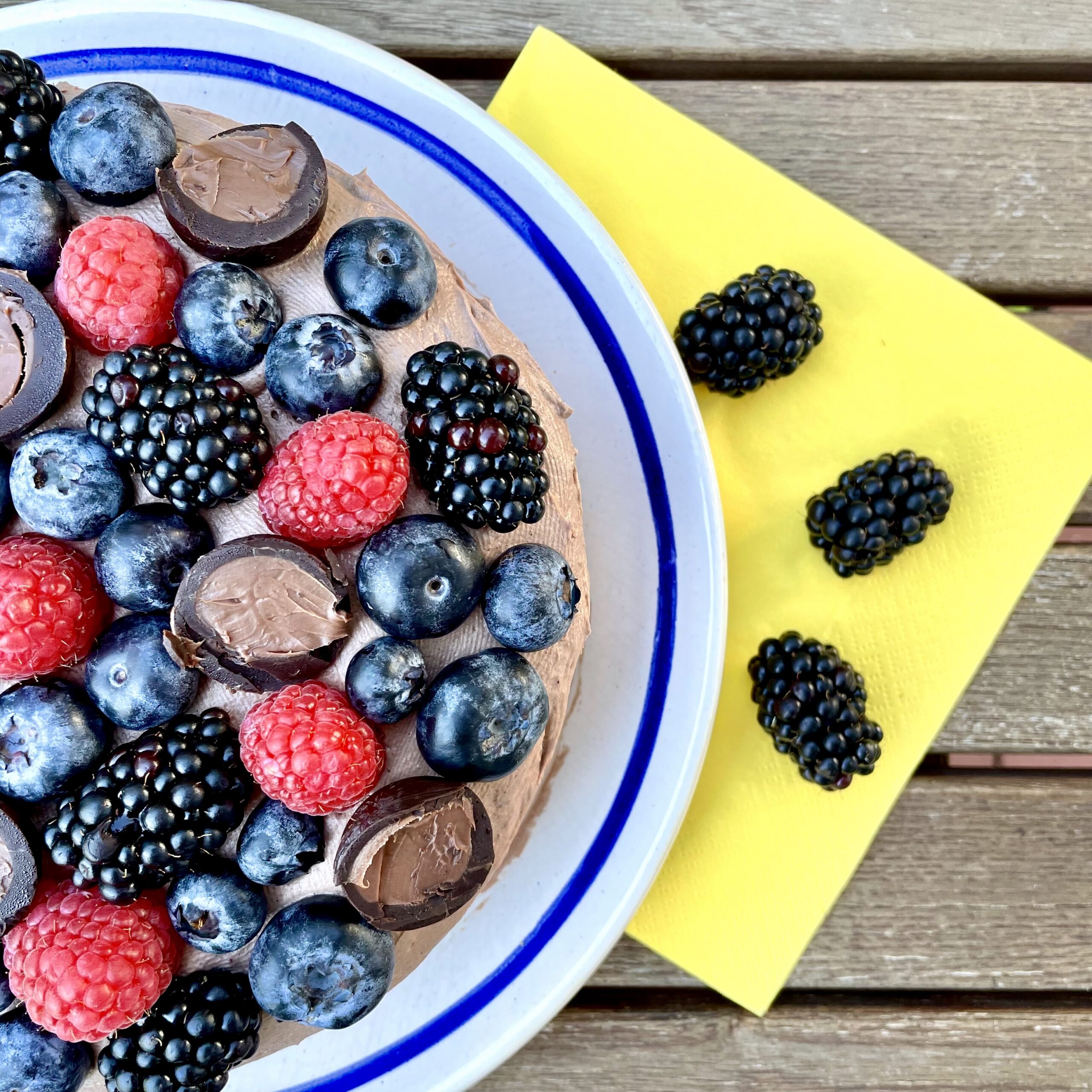 Die Beeren waschen und die Schokoladenkugeln halbieren. Damit die Torte dekorieren.